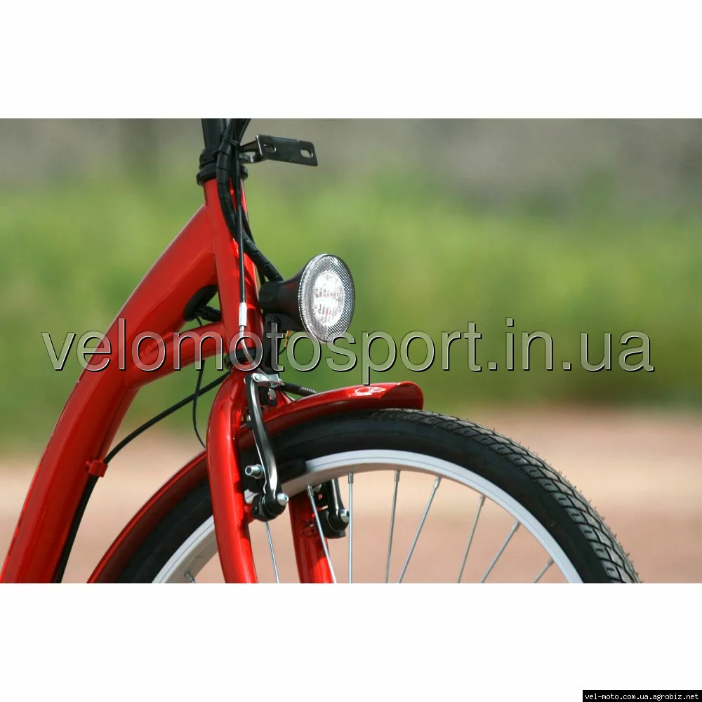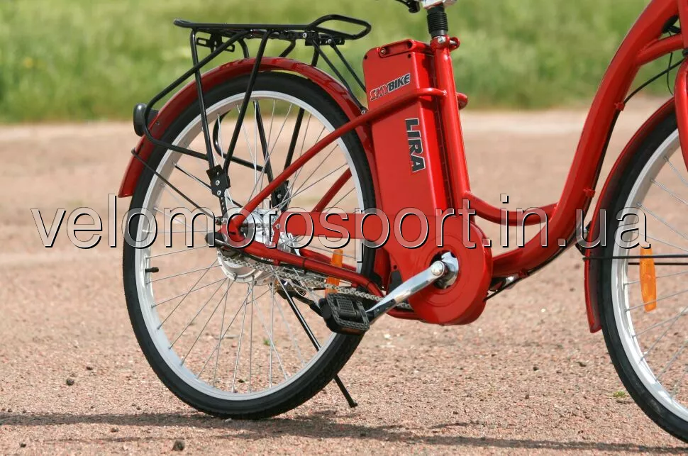 Электровелосипед скайбайк SKYBIKE LIRA ліра лира (350W-36V) - отличается простотой исполнения и большим диаметром колеса, что позволяет комфортно передвигаться в условиях городских дорог с асфальтным покрытием, по проселочным дорогам и пешеходным дорожкам в парке. Задний багажник позволит Вам разместить небольшую поклажу. Передний фонарь на светодиодах позволит без труда добраться домой в темное время суток. Небольшой электронный блок управления на левой стороне руля позволяет одним нажатием кнопки включить электромотор, освещение переднего фонаря, позволит включить один из трех различных скоростных режимов. Оснащен блоком управления для включения электромотора, фонаря или одного из трех скоростных режимов. Также показывает заряд батареи. Батарея литионная. Сзади установлена фиксирующая подножка