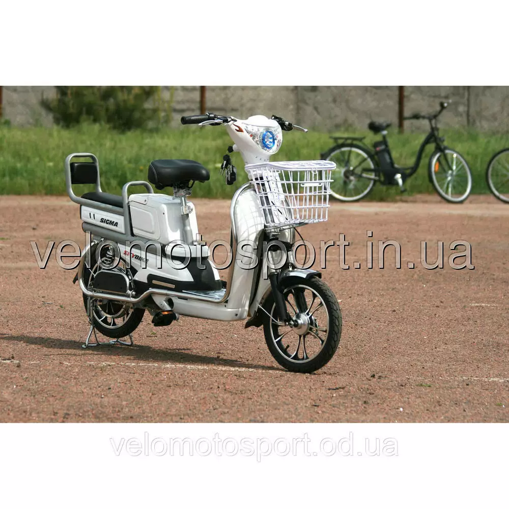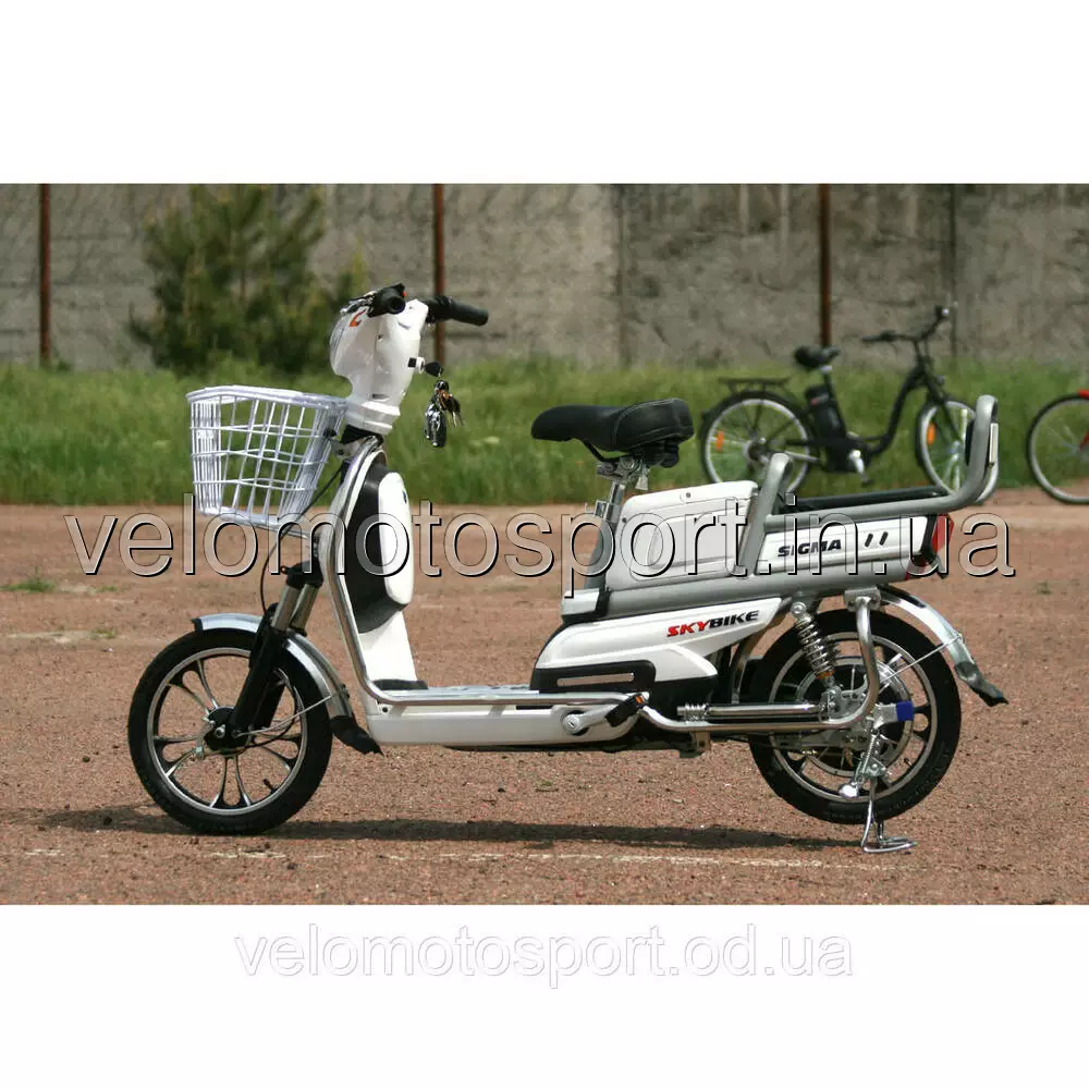 Электровелосипед Skybike Sigma - Электро велосипед SkyBike Sigma (450W-48V/20 А/ч) 2017 год, сигнализация, круиз-контроль,Электровелосипед отличается наличием подставки для ног, в отличие от большинства электрических велосипедов. Большая удобная сидушка. Вместительная передняя корзинка позволит Вам разместить достаточное количество багажа. За сидушкой водителя расположена сидушка пассажира с подспинком. Также к удобству пассажира можно безусловно добавить откидывающиеся подножки для ног. По периметру всего электровелосипеда закреплен металлический обод, который предохранит пластик от царапин и повреждений. ТЕХНИЧЕСКИЕ ХАРАКТЕРИСТИКИ: Рекоменд. макс. скорость (км/ч) 25Рекоменд. макс. нагрузка (кг) 100