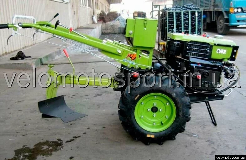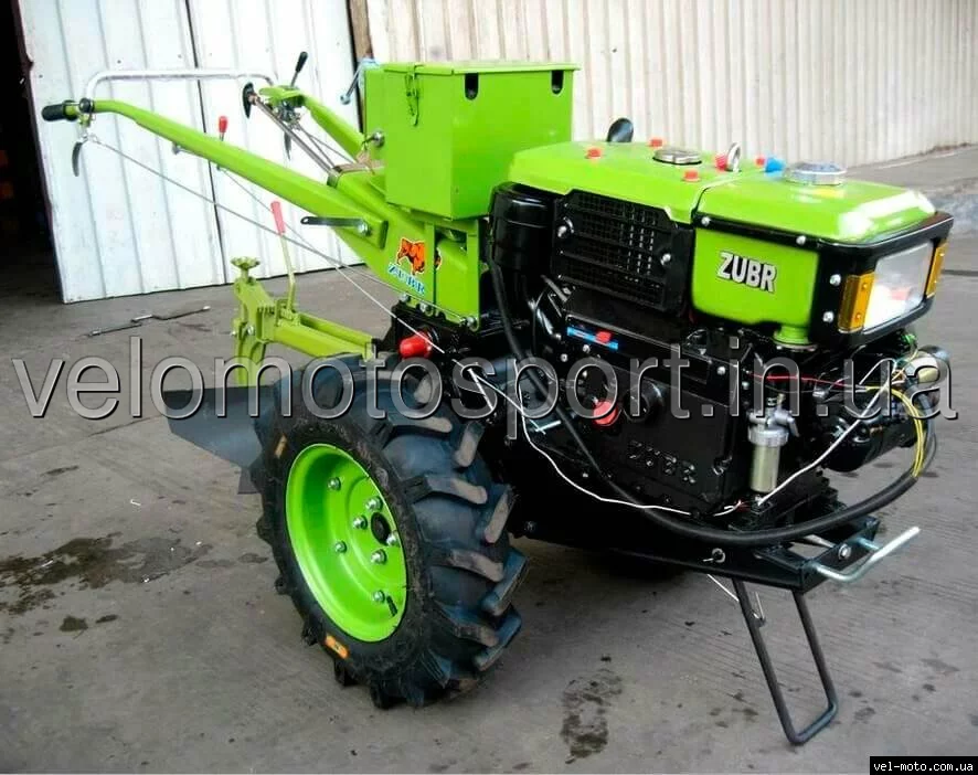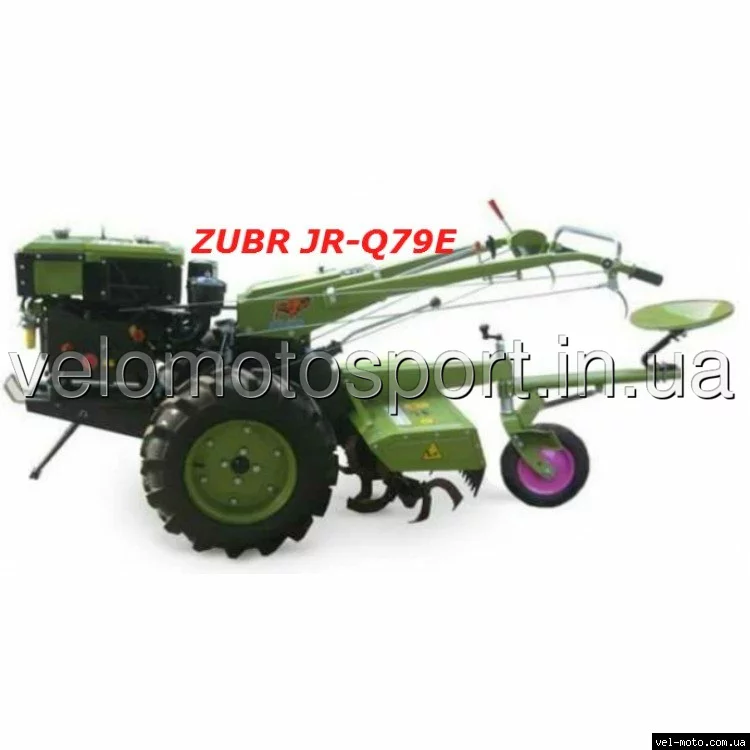 ZUBR(Зубр) JR-Q79Е(эл.стартер) - мощный мотоблок из модельного ряда ZUBR. Мотоблок оснащен дизельным двигателем мощностью 9,6 л.с. с установленным электростартером и аккумулятором "Varta". Рассчитан на большие площади обработки, в стандартной комплектации - входит новая активная почвофреза увеличенного размера, перекрывающая колею колес. По сути - это трехколесный трактор. Галогеновая фара позволит работать в темное время суток. Большой выбор агрегатируемого навесного оборудования. Мотоблок оснащен редуктором нового типа с дополнительным валом отбора мощности. Мотоблок ZUBR JR-Q79Е (эл.стартер) позволит выполнять все необходимые земельные, и не только, работы.Для дизельного мотоблока Zubr JR-Q79E имеется множество видов навесного оборудования, которое будет помогать выполнять различные задачи. Данная модель имеет задний шестеренчатый вал отбора мощности для подключения на него почвофрезы, ещё она оснащена передним ременным для роторной сенокосилки и вибрационной картофелекопалки. Также можно приобрести прицеп на котором можно перевозить грузы до 500 кг. Большие резиновые колеса аппарата с шевронным рисунком протектора повышают проходимость.Мотоблок Зубр JR-Q79E(плуг+фреза):