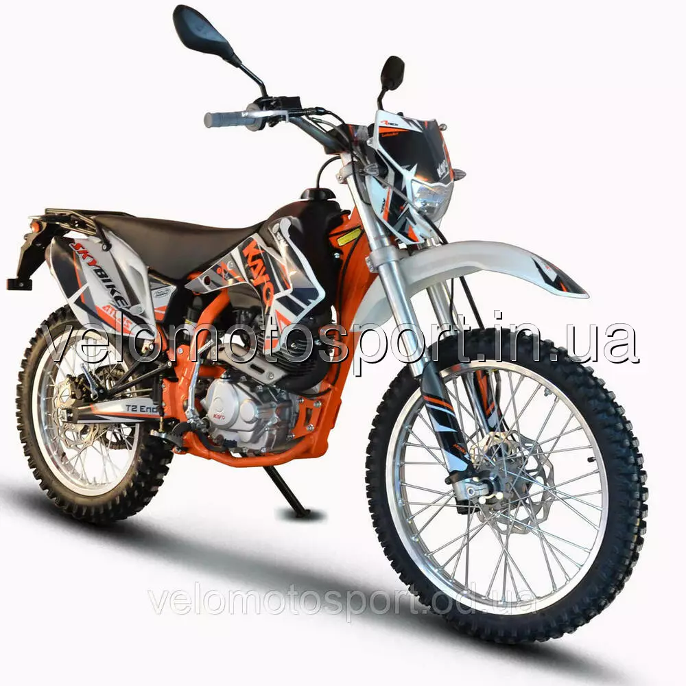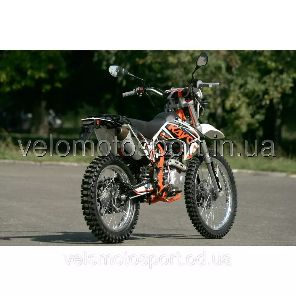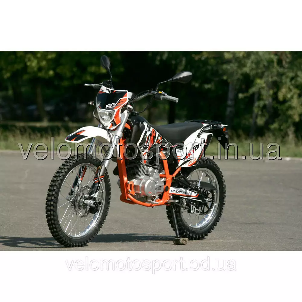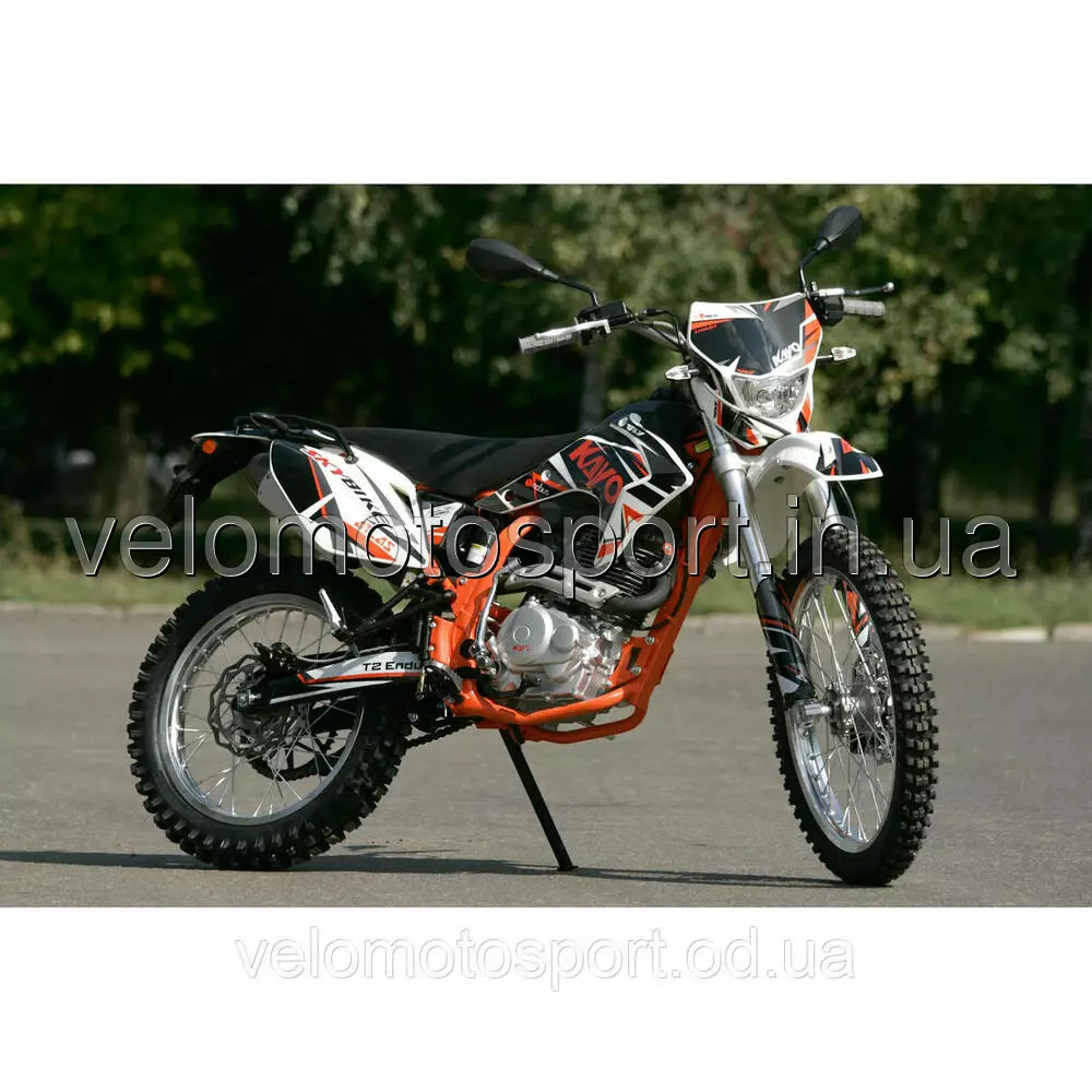 Мотоцикл Skybike KAYO T2-250 куб. - на мотоцикле установлен 1 цилиндровый, 4-х тактный двигатель воздушного охлаждения с верхним распредвалом с мощностью 16,4 л.с. при 7000 об.мин., с объемом 223 см.куб. Модернизация коснулась также несущей рамы мотоцикла. Топливная смесь подается с помощью карбюратора, зажигание электронное. Передняя вилка перевернутого типа длиной 800 мм, не регулируемая, передний дисковый тормоз с двухпоршневым суппортом. Задняя подвеска выполнена на линке прогрессии с амортизатором длиной 420 мм., задний дисковый тормоз также оснащен двухпоршневым суппортом. Коробка передач механическая с международной схемой переключения 5-ю передачами и нейтралкой. Приводная цепь 520-я, безсальниковая, соотношение ведущей и задней звезды 13Т-45Т. Объем топливного бака расширен до емкости 9,5 л. Обода переднего и заднего колес мотоцикла из алюминия. ХАРАКТЕРИСТИКИ:Высота сидушки