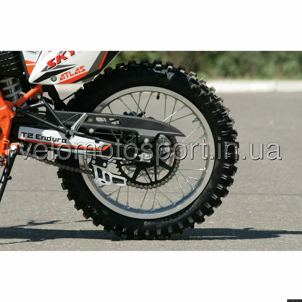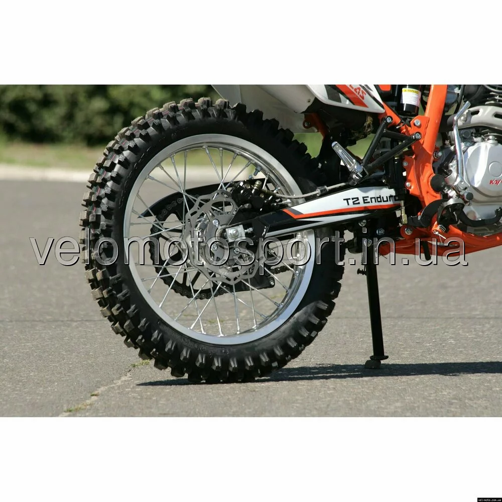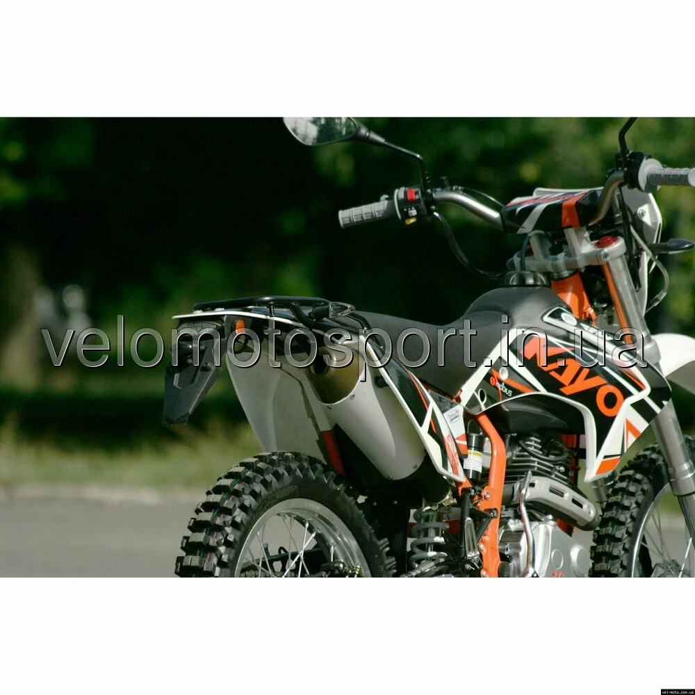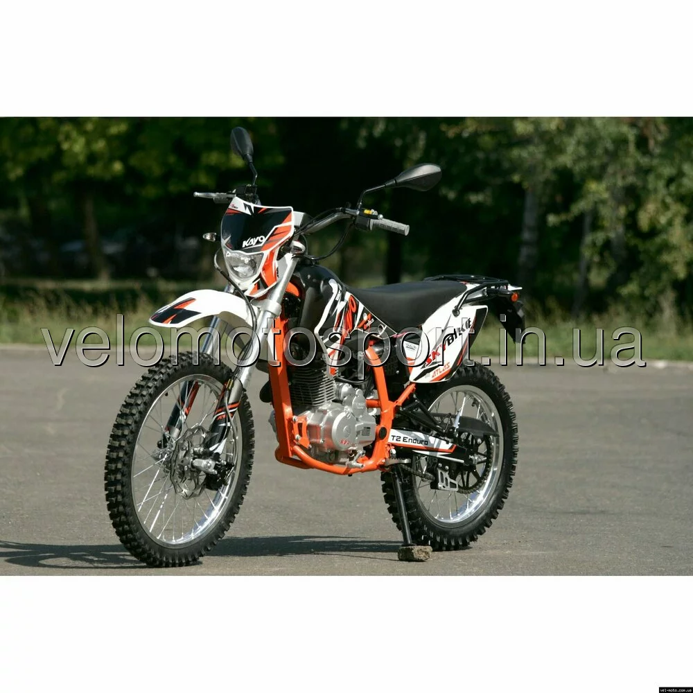 Мотоцикл Skybike KAYO T2-250 - Руль на мотоцикле установили легкосплавный, с переменным сечением. На мотоцикле установлен 1 цилиндровый, 4-х тактный двигатель воздушного охлаждения с верхним распредвалом с мощностью 16,4 л.с. при 7000 об.мин., с объемом 223 см.куб. Модернизация коснулась также несущей рамы мотоцикла. Топливная смесь подается с помощью карбюратора, зажигание электронное. Передняя вилка перевернутого типа длиной 800 мм, не регулируемая, передний дисковый тормоз с двухпоршневым суппортом. Задняя подвеска выполнена на линке прогрессии с амортизатором длиной 420 мм., задний дисковый тормоз также оснащен двухпоршневым суппортом. Коробка передач механическая с международной схемой переключения 5-ю передачами и нейтралкой. ТЕХНИЧЕСКИЕ ХАРАКТЕРИСТИКИ:
