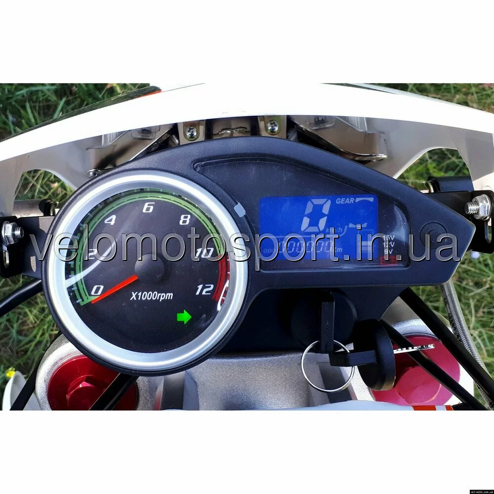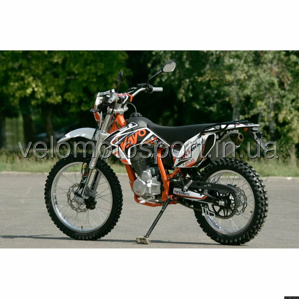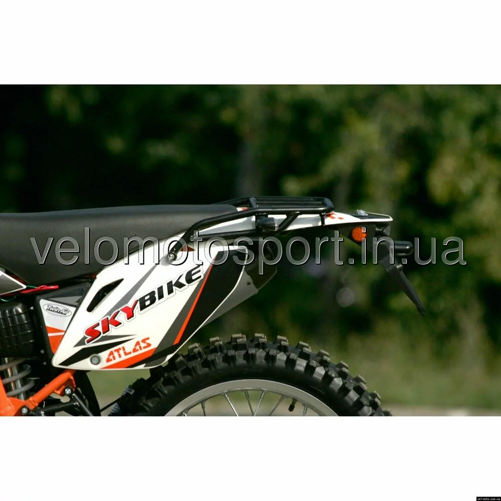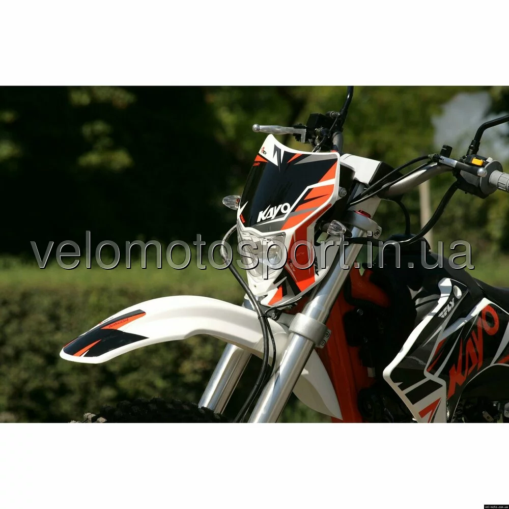 Мотоцикл Skybike KAYO T2-250 - Руль на мотоцикле установили легкосплавный, с переменным сечением. На мотоцикле установлен 1 цилиндровый, 4-х тактный двигатель воздушного охлаждения с верхним распредвалом с мощностью 16,4 л.с. при 7000 об.мин., с объемом 223 см.куб. Модернизация коснулась также несущей рамы мотоцикла. Топливная смесь подается с помощью карбюратора, зажигание электронное. Передняя вилка перевернутого типа длиной 800 мм, не регулируемая, передний дисковый тормоз с двухпоршневым суппортом. Задняя подвеска выполнена на линке прогрессии с амортизатором длиной 420 мм., задний дисковый тормоз также оснащен двухпоршневым суппортом. Коробка передач механическая с международной схемой переключения 5-ю передачами и нейтралкой. ТЕХНИЧЕСКИЕ ХАРАКТЕРИСТИКИ: