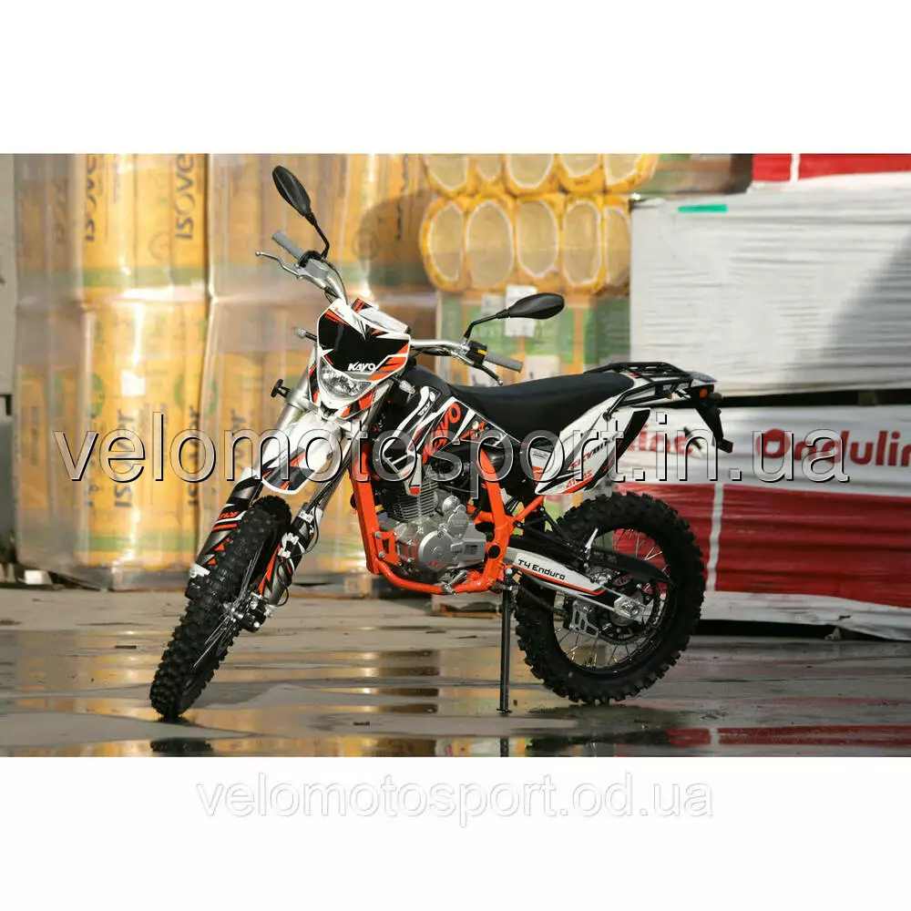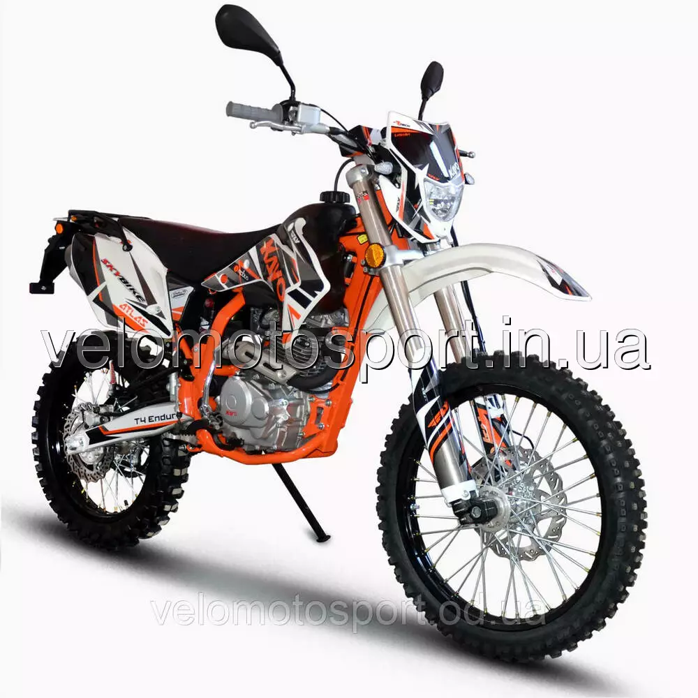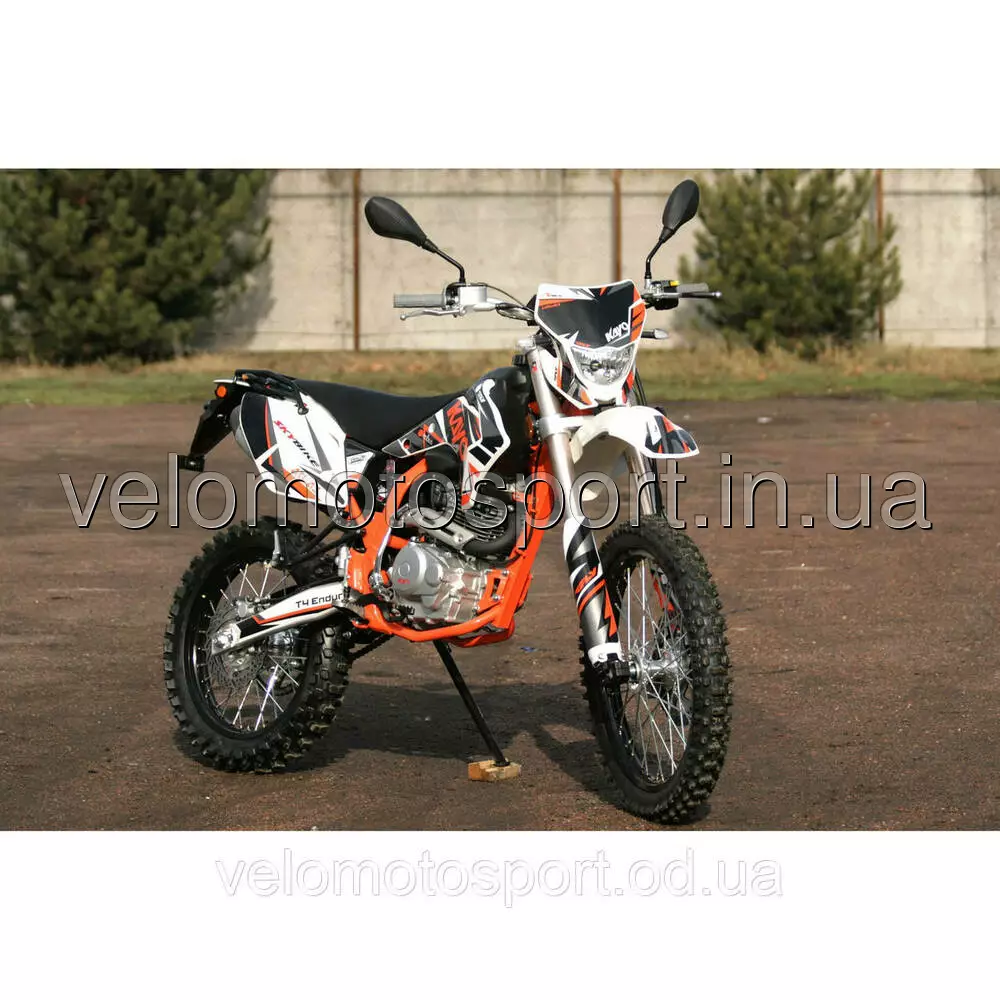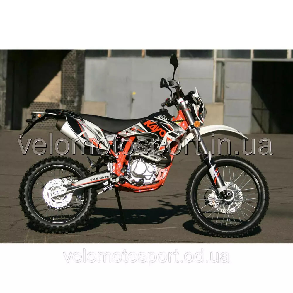 Мотоцикл Skybike KAYO T4-250 куб. - На мотоцикле установлен 1 цилиндровый, 4-х тактный двигатель воздушного охлаждения с верхним распредвалом, мощностью 16,4 л.с. при 7000 об.мин., объемом 223 см.куб. Модернизация коснулась в первую очередь несущей рамы мотоцикла. Топливная смесь подается с помощью карбюратора, зажигание электронное. Передняя вилка перевернутого типа длиной 880 мм (в отличии от 800 мм на T2), с регулировками обратного хода пружины и компрессии, производства известной компании FAST ACE (кстати, большего диаметра, чем на T2), передний дисковый тормоз с двухпоршневым суппортом. Диск переднего тормоза шире, чем на T2, на 30 мм. Задняя подвеска выполнена на линке прогрессии с амортизатором длиной 450 мм., также производства компании FAST ACE, с регулировками степени демпфирования, обратного хода и передняя тяга пружины и газовой подкачкой. Задние дисковые тормоза, в отличие от T2, оснащены однопоршневым суппортом. Задний тормозной диск шире, чем на Т2 , на 20 мм. Коробка передач механическая, 5-ступенчатая, с международной схемой переключения передач. Приводная цепь 520-я, соотношение ведущей и задней звезды 13Т-45Т. ХАРАКТЕРИСТИКИ:Высота сидушки