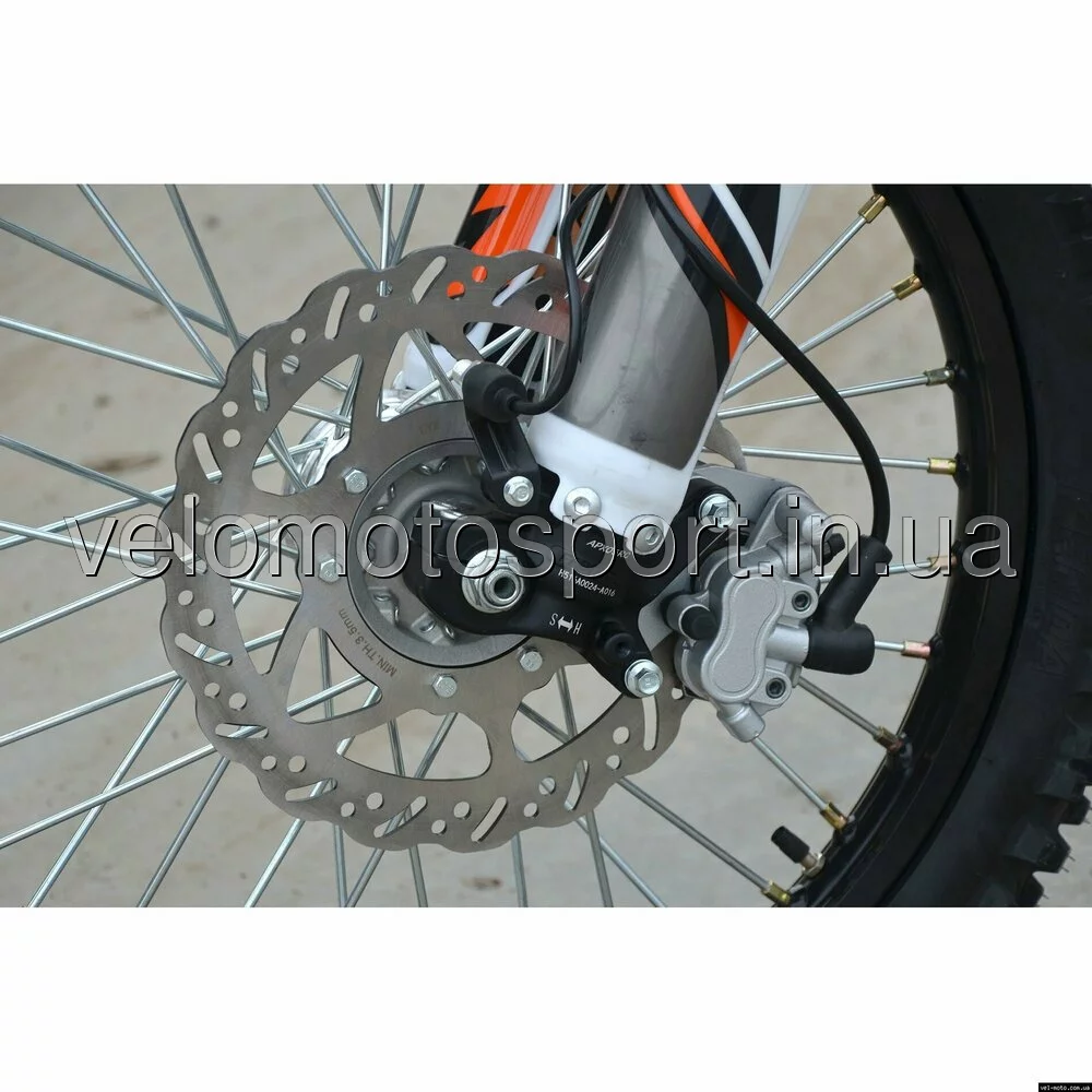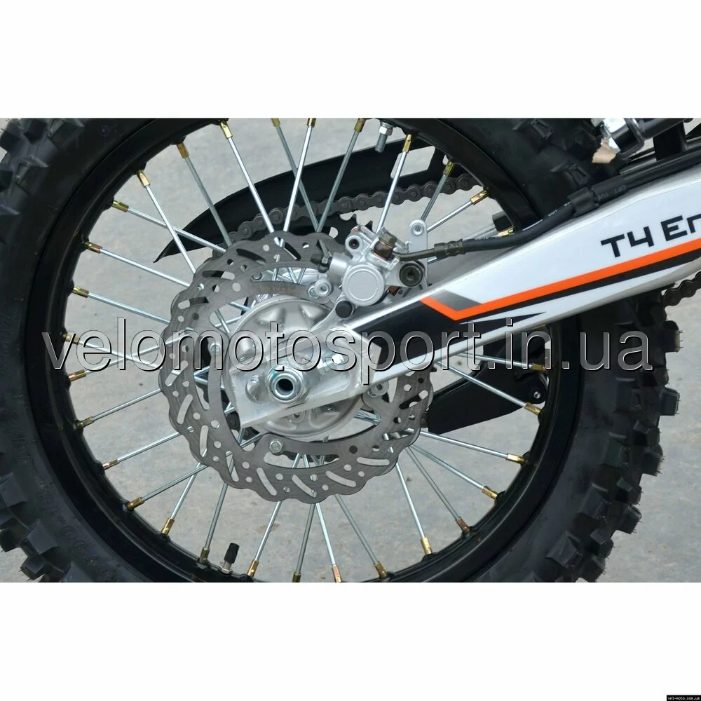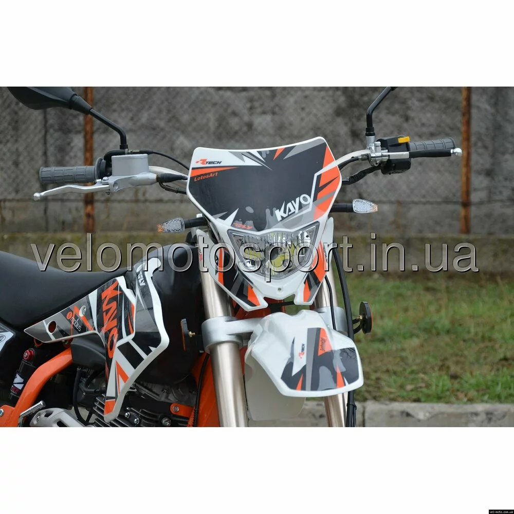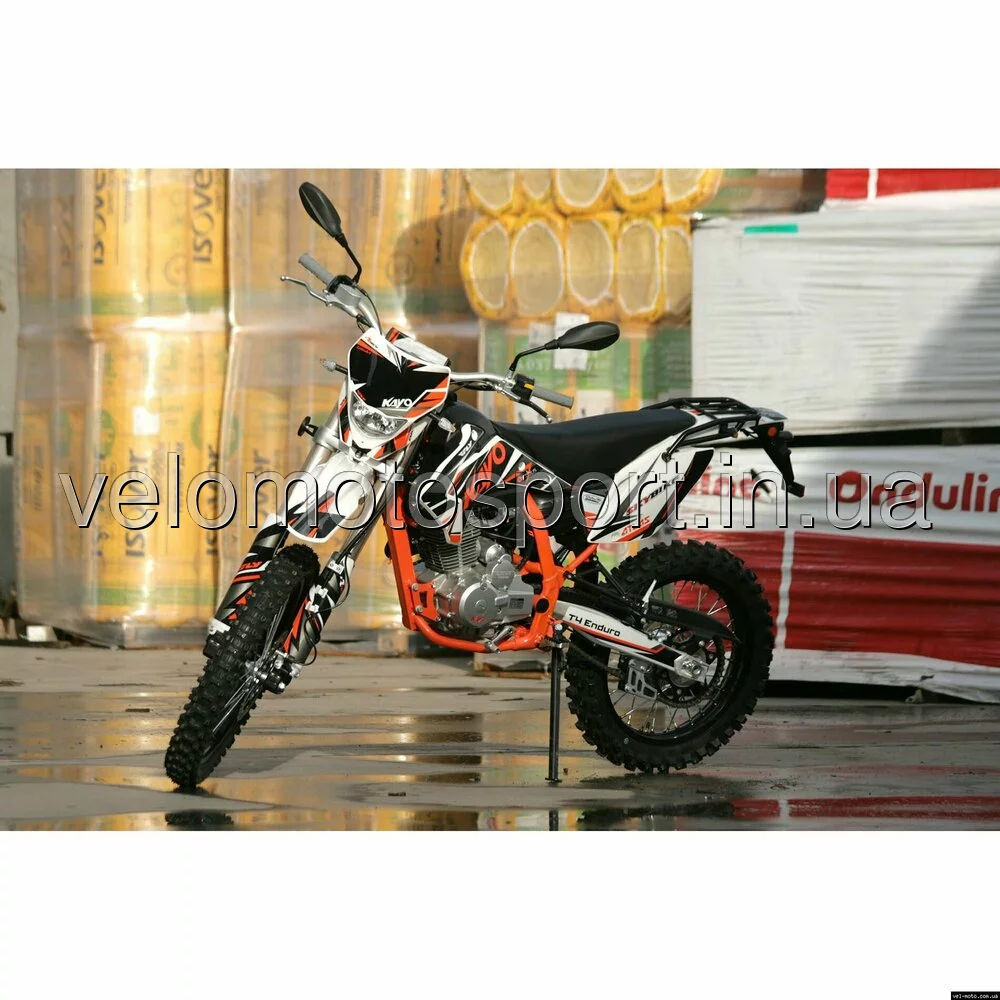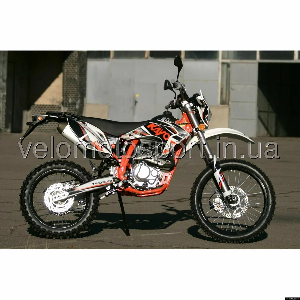 Мотоцикл Skybike KAYO T4-250 - На мотоцикле установлен 1 цилиндровый, 4-х тактный двигатель воздушного охлаждения с верхним распредвалом, мощностью 16,4 л.с. при 7000 об.мин., объемом 223 см.куб.Топливная смесь подается с помощью карбюратора, зажигание электронное. Передняя вилка перевернутого типа длиной 880 мм (в отличии от 800 мм на T2), с регулировками обратного хода пружины и компрессии.передний дисковый тормоз с двухпоршневым суппортом. Диск переднего тормоза шире, чем на T2, на 30 мм. Задняя подвеска выполнена на линке прогрессии с амортизатором длиной 450 мм., также производства компании FAST ACE, с регулировками степени демпфирования, обратного хода и преднатяга пружины и газовой подкачкой. Задние дисковые тормоза, в отличие от T2, оснащены однопоршневым суппортом. Задний тормозной диск шире, чем на Т2 , на 20 мм. Коробка передач механическая, 5-ступенчатая, с международной схемой переключения передач. Приводная цепь 520-я, соотношение ведущей и задней звезды 13Т-45Т. ТЕХНИЧЕСКИЕ ХАРАКТЕРИСТИКИ: