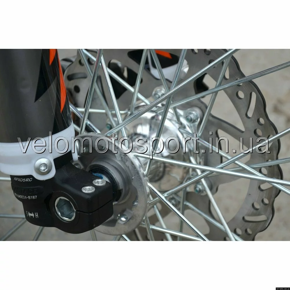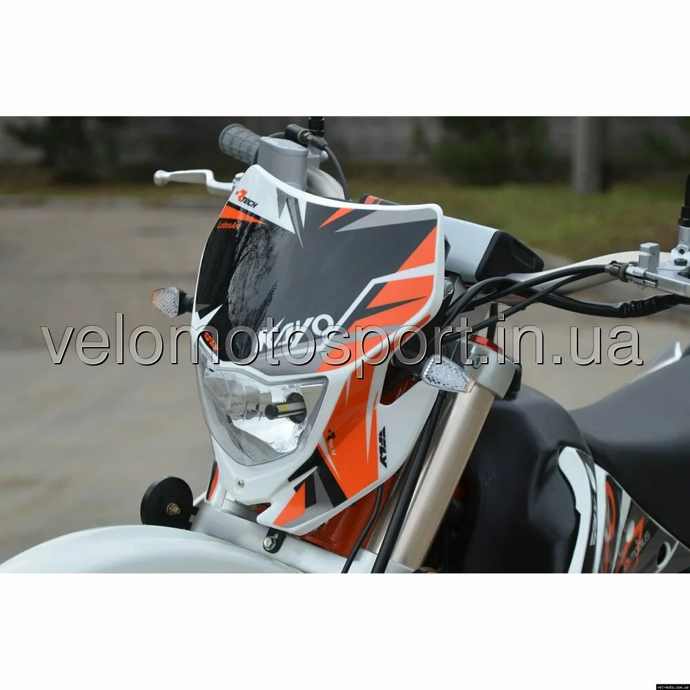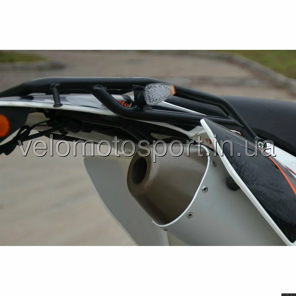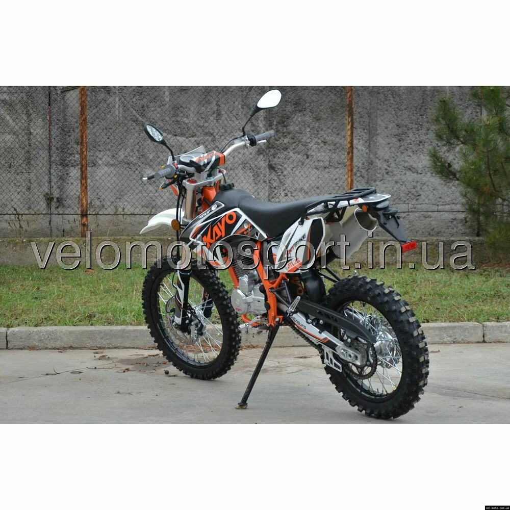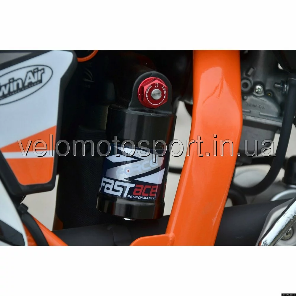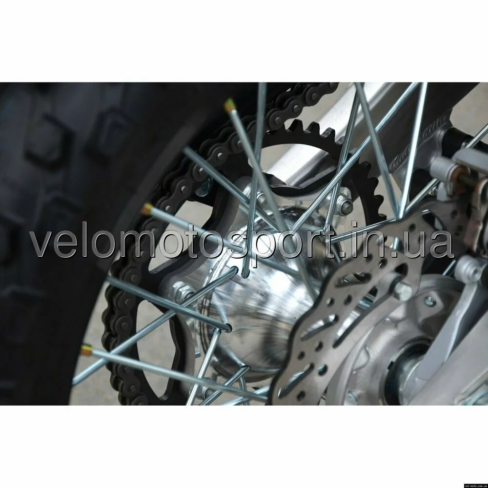 Мотоцикл Skybike KAYO T4-250 - На мотоцикле установлен 1 цилиндровый, 4-х тактный двигатель воздушного охлаждения с верхним распредвалом, мощностью 16,4 л.с. при 7000 об.мин., объемом 223 см.куб.Топливная смесь подается с помощью карбюратора, зажигание электронное. Передняя вилка перевернутого типа длиной 880 мм (в отличии от 800 мм на T2), с регулировками обратного хода пружины и компрессии.передний дисковый тормоз с двухпоршневым суппортом. Диск переднего тормоза шире, чем на T2, на 30 мм. Задняя подвеска выполнена на линке прогрессии с амортизатором длиной 450 мм., также производства компании FAST ACE, с регулировками степени демпфирования, обратного хода и преднатяга пружины и газовой подкачкой. Задние дисковые тормоза, в отличие от T2, оснащены однопоршневым суппортом. Задний тормозной диск шире, чем на Т2 , на 20 мм. Коробка передач механическая, 5-ступенчатая, с международной схемой переключения передач. Приводная цепь 520-я, соотношение ведущей и задней звезды 13Т-45Т. ТЕХНИЧЕСКИЕ ХАРАКТЕРИСТИКИ: