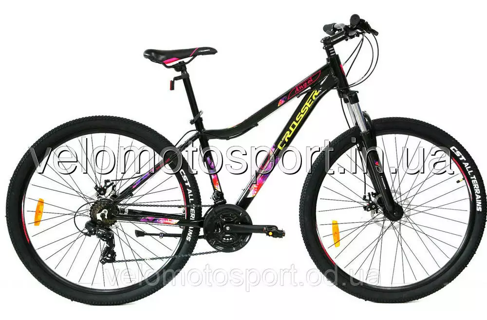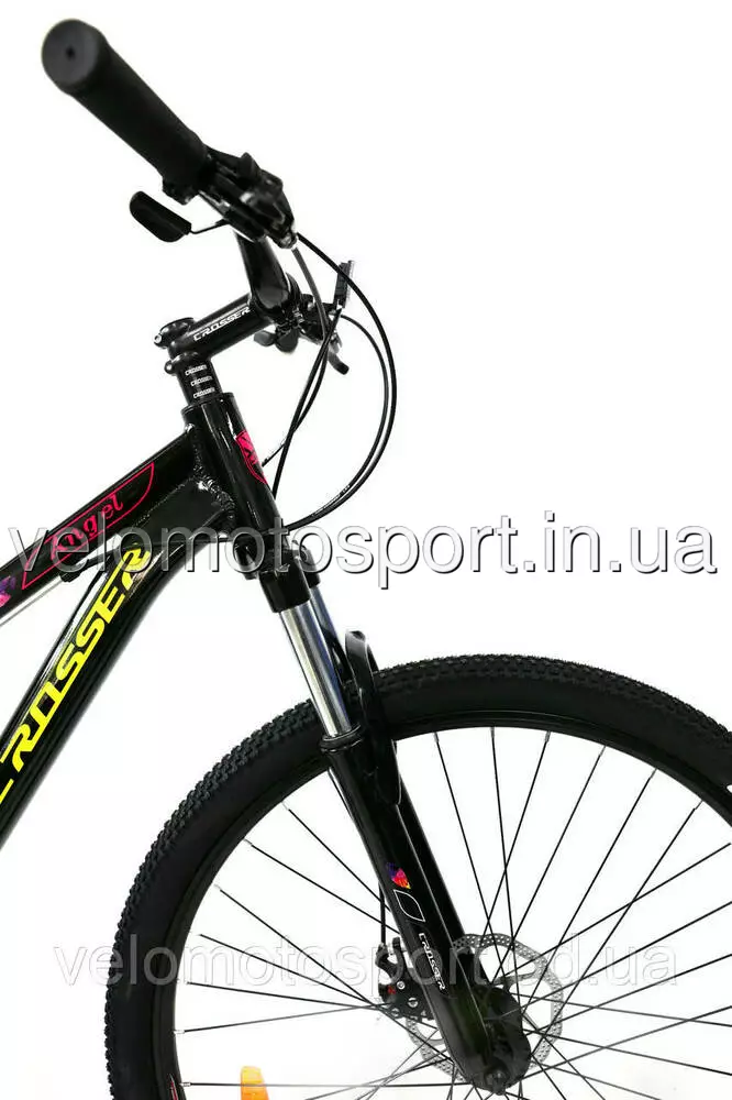 Велосипед Crosser Angel 29 - НОВИНКА!!! - роскошный горный хардтейл с современной рамой разработанный специально для девушек.Маленькая рама в сочетании с большими колесами позволит ощутить все преимущества 29 колес даже людям невысокого роста от 150 см и подросткам, а удачное решении геометрии позволит с комфортом использовать данную модель и тем велосипедистам, рост которых достигает 180 см.Crosser Angel 29 обладает рамой с очень удачной геометрией, благодаря небольшой ростовке велосипед может похвастаться отличным управлением и достаточно высоким уровнем комфорта для горного велика.Амортизационная вилка, которая снизит нагрузку на руки и поможет лучше конроллировать управление на участках с плохой дорогой.Велосипед оборудован надежными дисковыми механическими тормозами с роторами Avid по 160 мм. Трансмиссия от Shimano на 21 скорость обеспечит достаточный диапазон передач практически для любой ситуации!Характеристики: